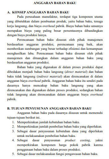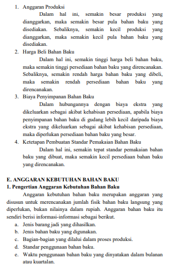 Selanjutnya, dari anggaran produksi ditentukan anggaran bahan baku, yaitu jumlah dan biaya bahan baku yang diperlukan untuk memenuhi rencana produksi. Dengan demikian, anggaran bahan baku bergantung langsung pada jumlah produksi yang direncanakan.